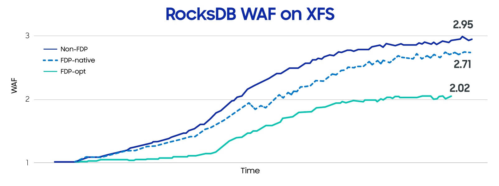 图1. RocksDB在关闭FDP,开启FDP使用原生分类策略和优化分类策略的WAF对比