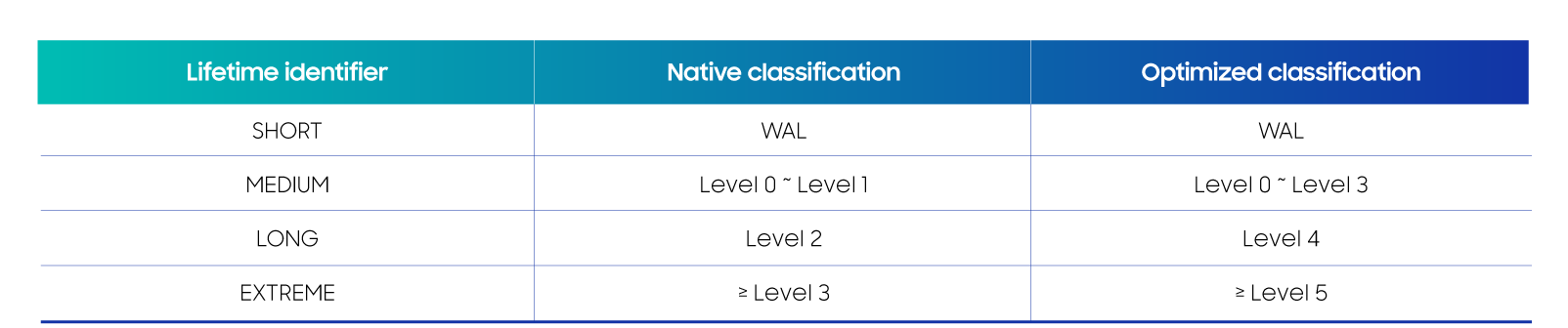 通过对RocksDB的数据分类策略进行系统性分析,我们发现SSTable文件在LSM-Tree层级中的生命周期存在显著的阶段性分布特征:位于Level0至Level3的SSTable 文件具有相对较短的驻留周期,而Level4以及上的文件则展现出最长的存活时间。基于这一观测结果,本实验摒弃了RocksDB原生的数据分类策略,转而提出一种优化的分类方案。即WAL文件标记保持不变,将Level0~3文件标记为MEDIUM,Level4文件标记为LONG,Level5及以上文件标记为 EXTREME,其余未归类文件统一标记为NOT_SET。如表1所示: